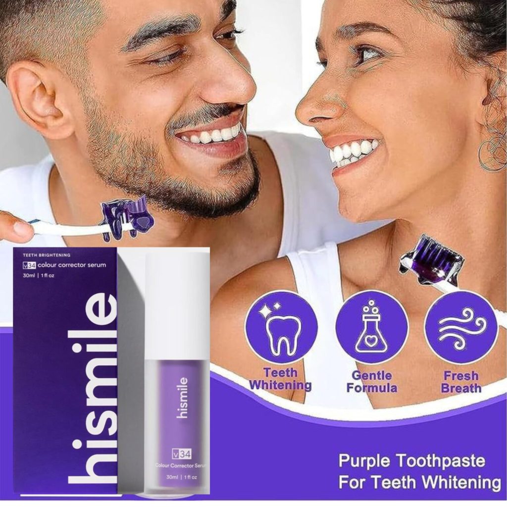 A smile that lights up every room. with Hismile purple power toothpaste corrector you can achieve that and more. our gentle yet effective formula is safe for your enamel, ensuring long-lasting results without the sensitivity. Experience the refreshing mint flavor that leaves your mouth feeling clean and revitalized.